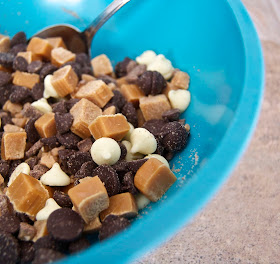 Mix in chocolate chips, toffee bits and caramels.